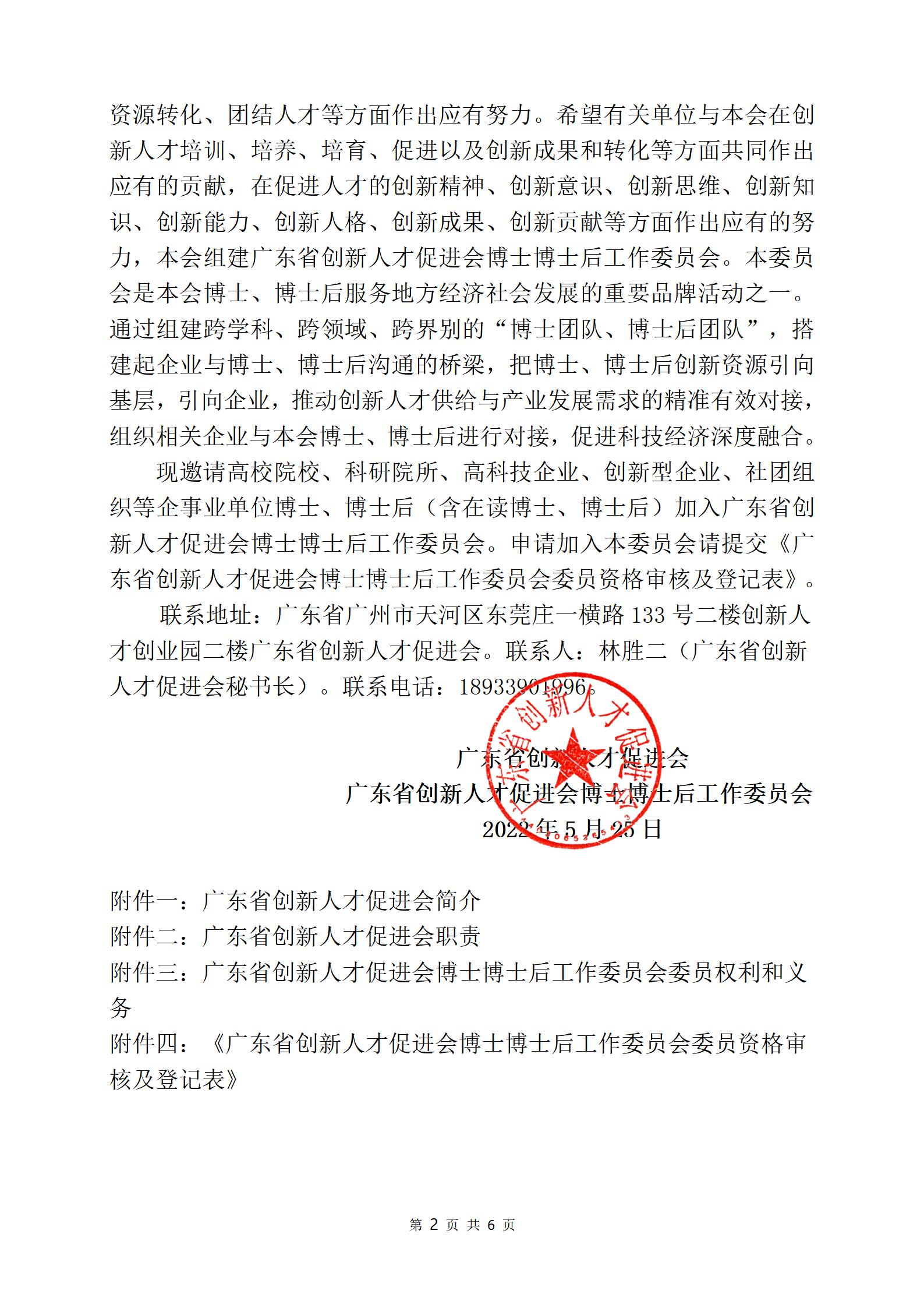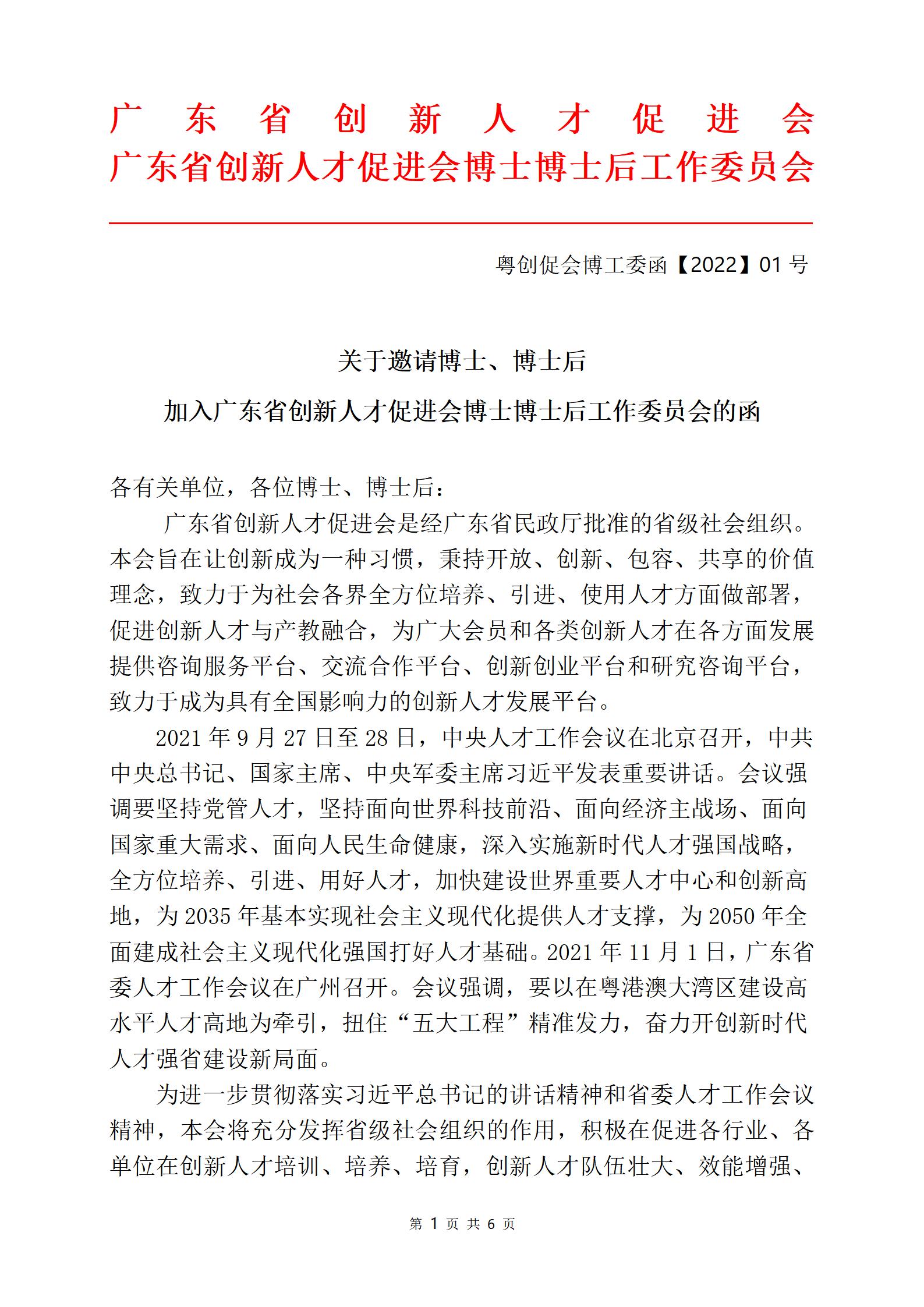 加入广东省创新人才促进会土博士博士后工作委员会的邀请函
